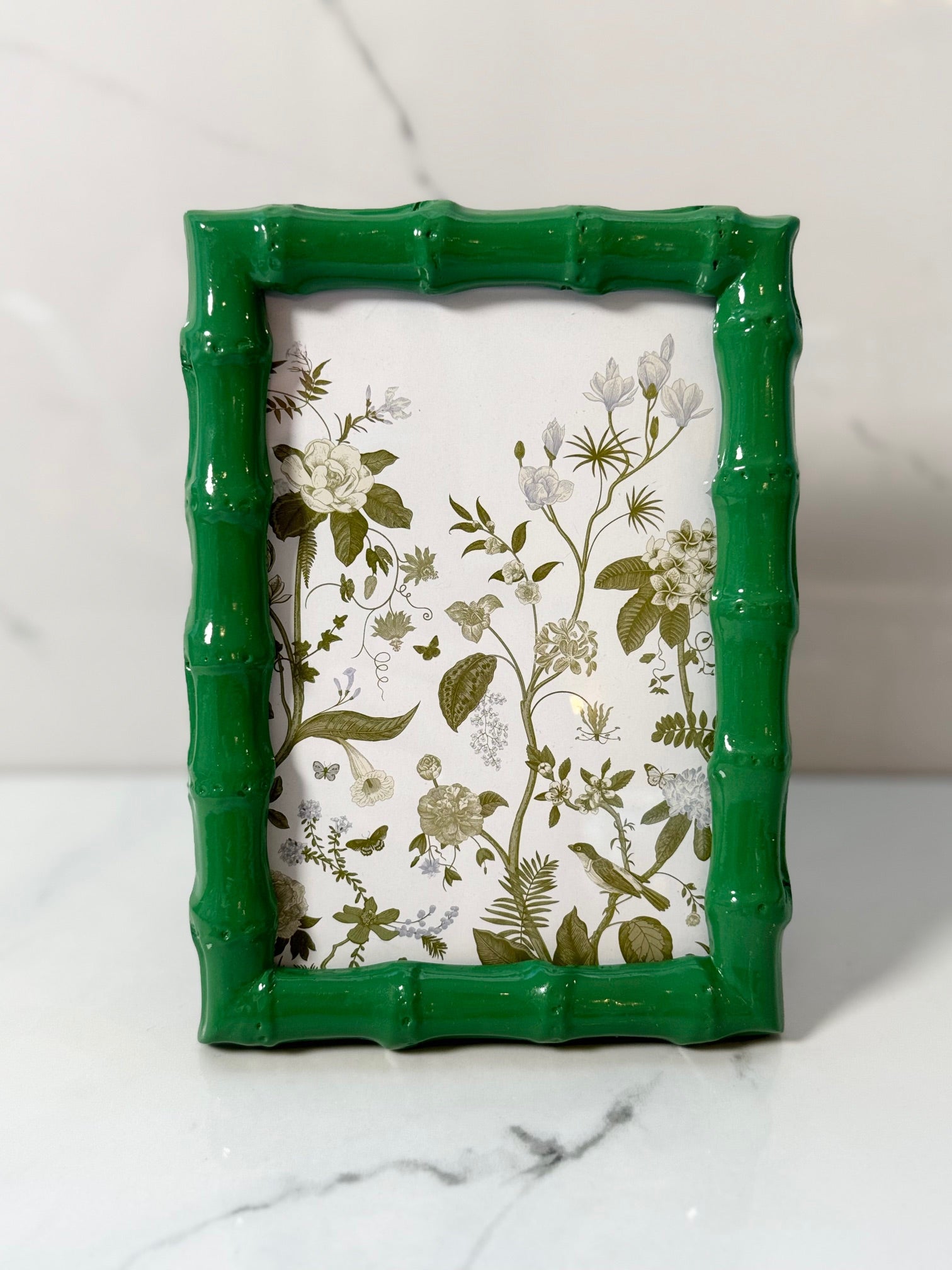 Made of matte finish faux bamboo that will look so great in any home or beach house. Frame comes with beautiful hues of green and white floral designed insert. Stands both horizontally and vertically, and can also be hung.