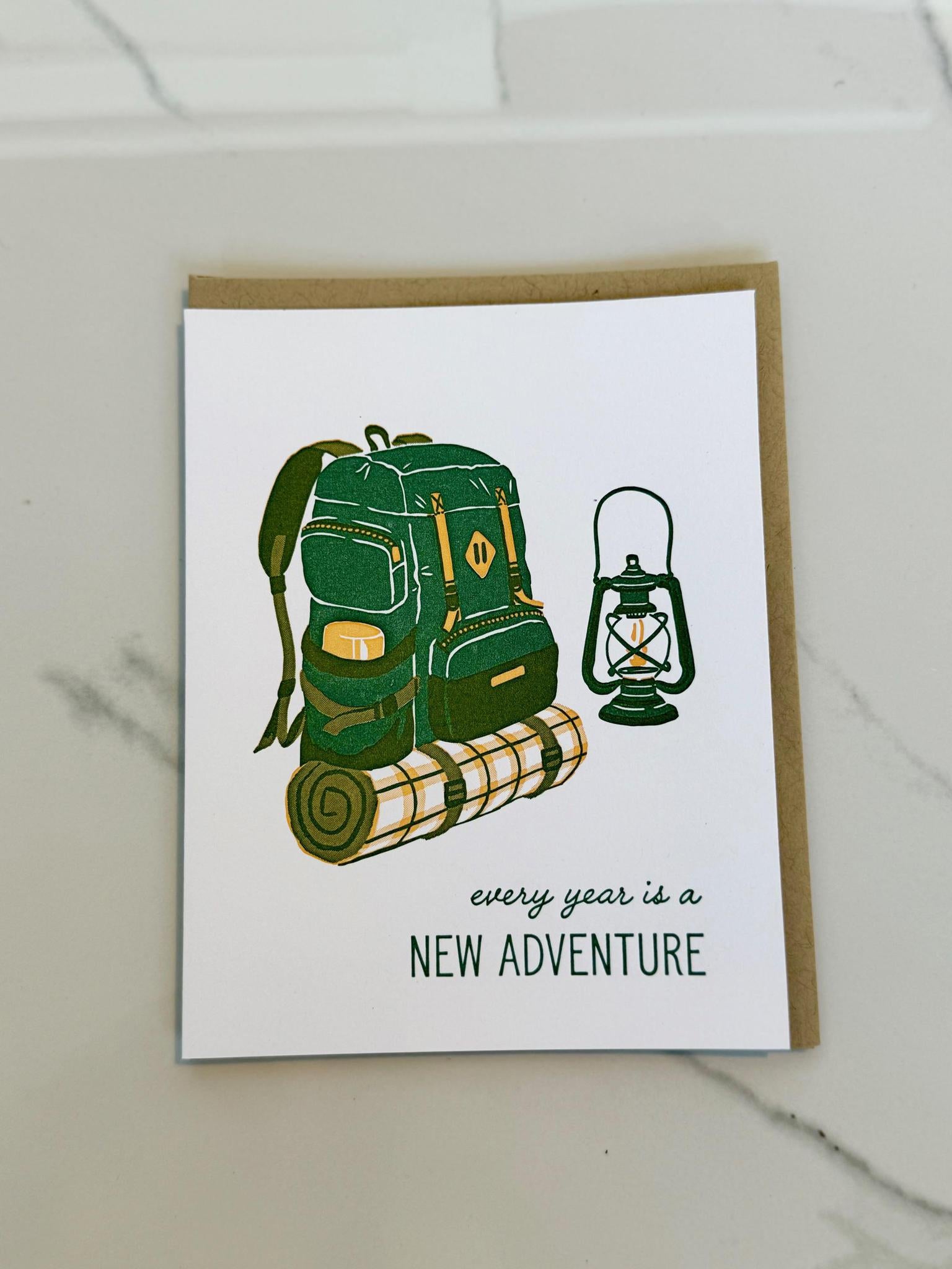 Front: Every year is a new adventure; inside message: Hope it's a good one!