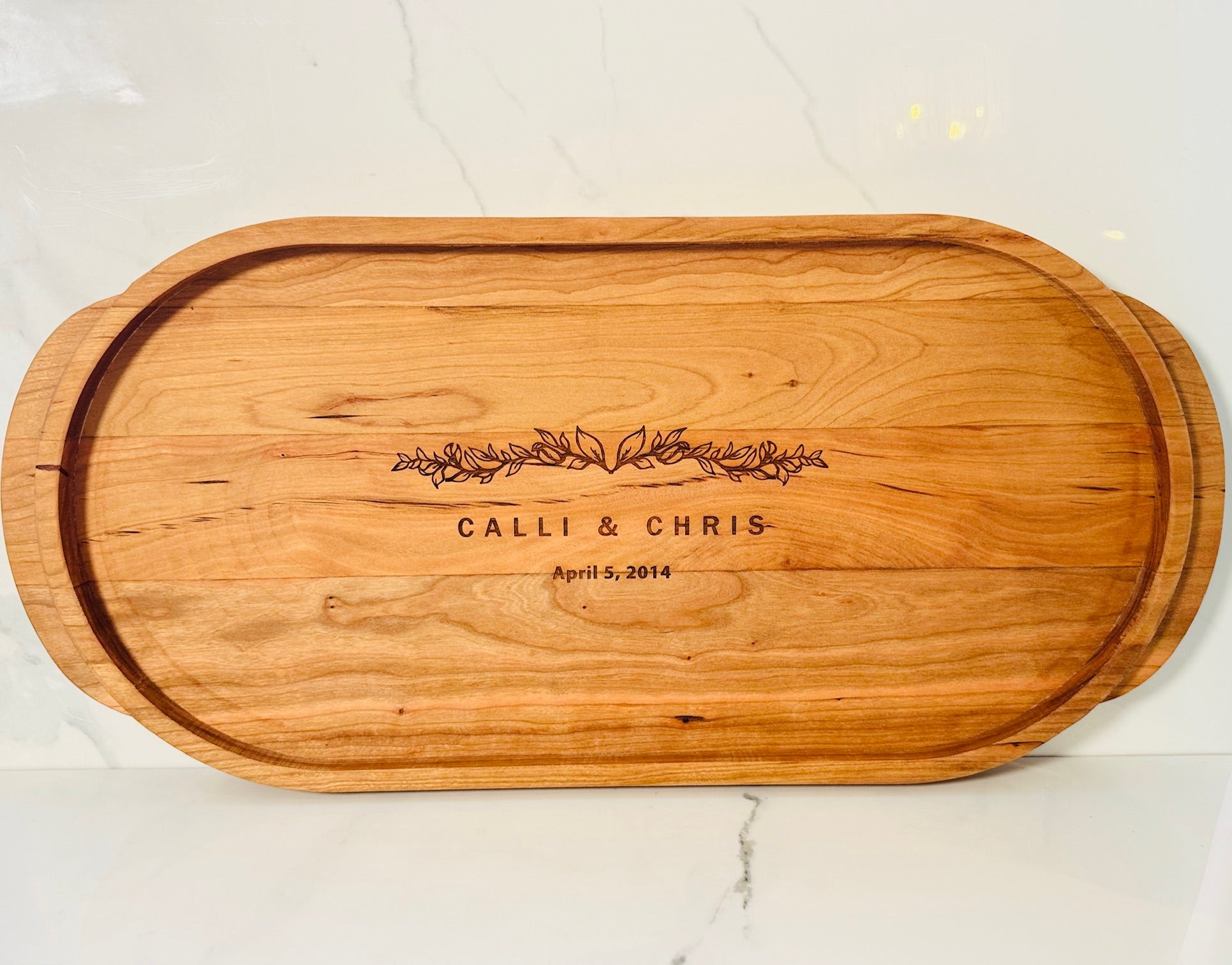 Crafted from premium cherry wood, this 21 1/2" x 10" x 1 1/4" serving platter features sturdy handles for easy carrying. Its smooth, rich finish enhances any presentation, making it ideal for serving or display. Customizable for any occasion, it offers a personalized touch that elevates gatherings or gifts with timeless elegance.