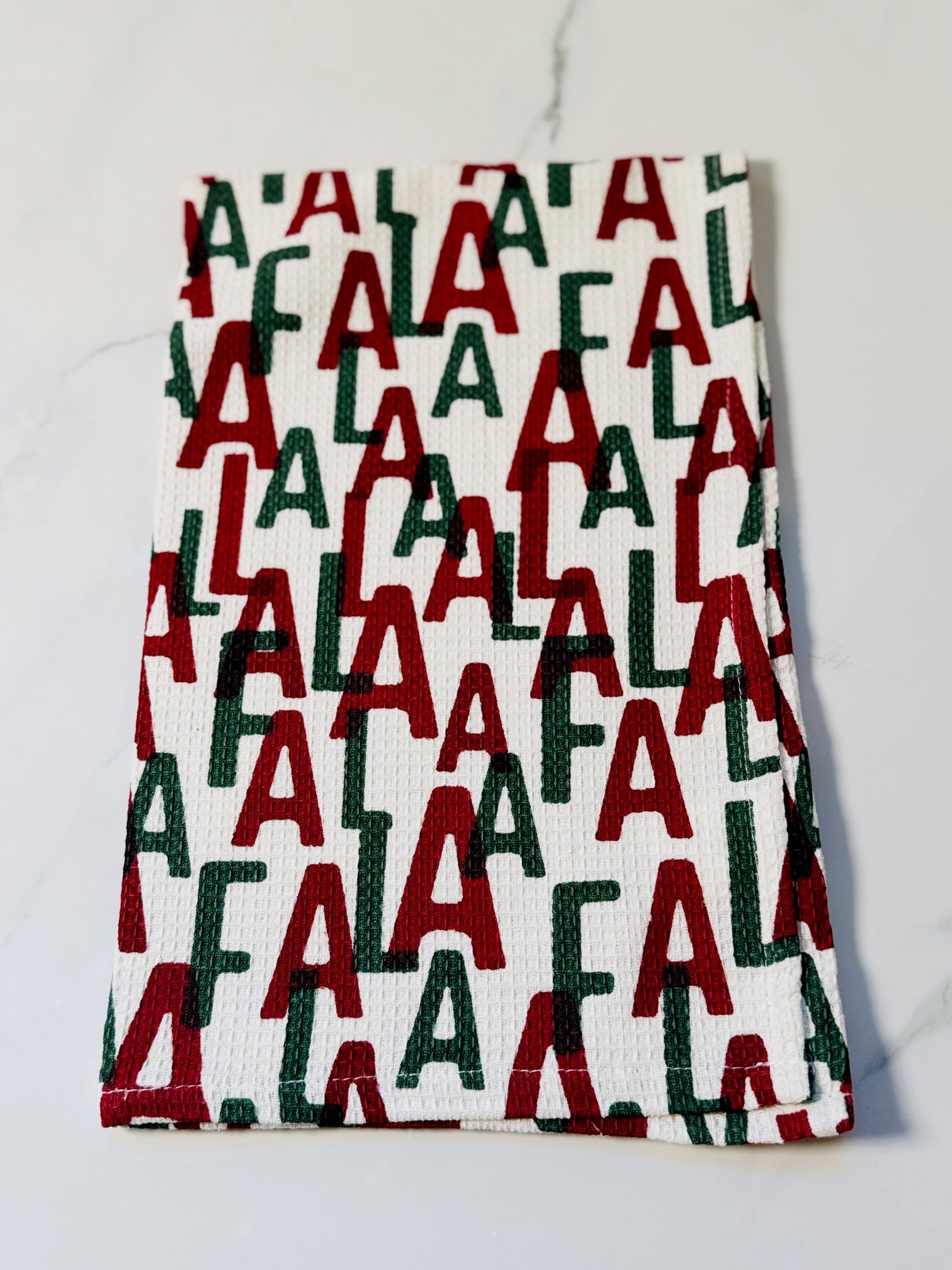 Washed waffle weave "FA LA LA" hand towel, perfect for your kitchen or wrap a bottle of wine with it for a fun hostess gift. Spot clean only.