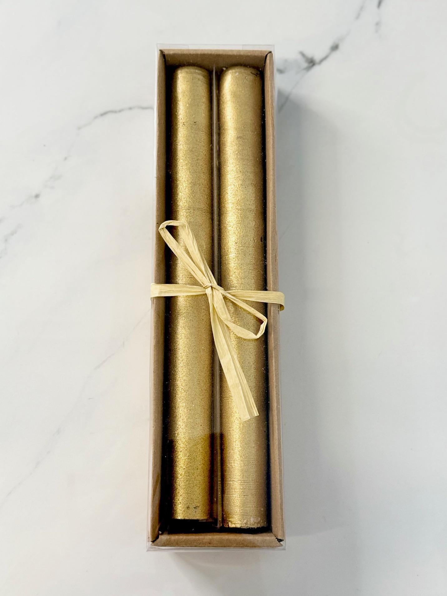 Crafted with elegance and sophistication, our Gold Leaf Candle Sticks are a must-have for any home. Made with real gold leaf, our taper candles add a touch of luxury to any space. Elevate your home decor with this stunning set. 9" set of 2