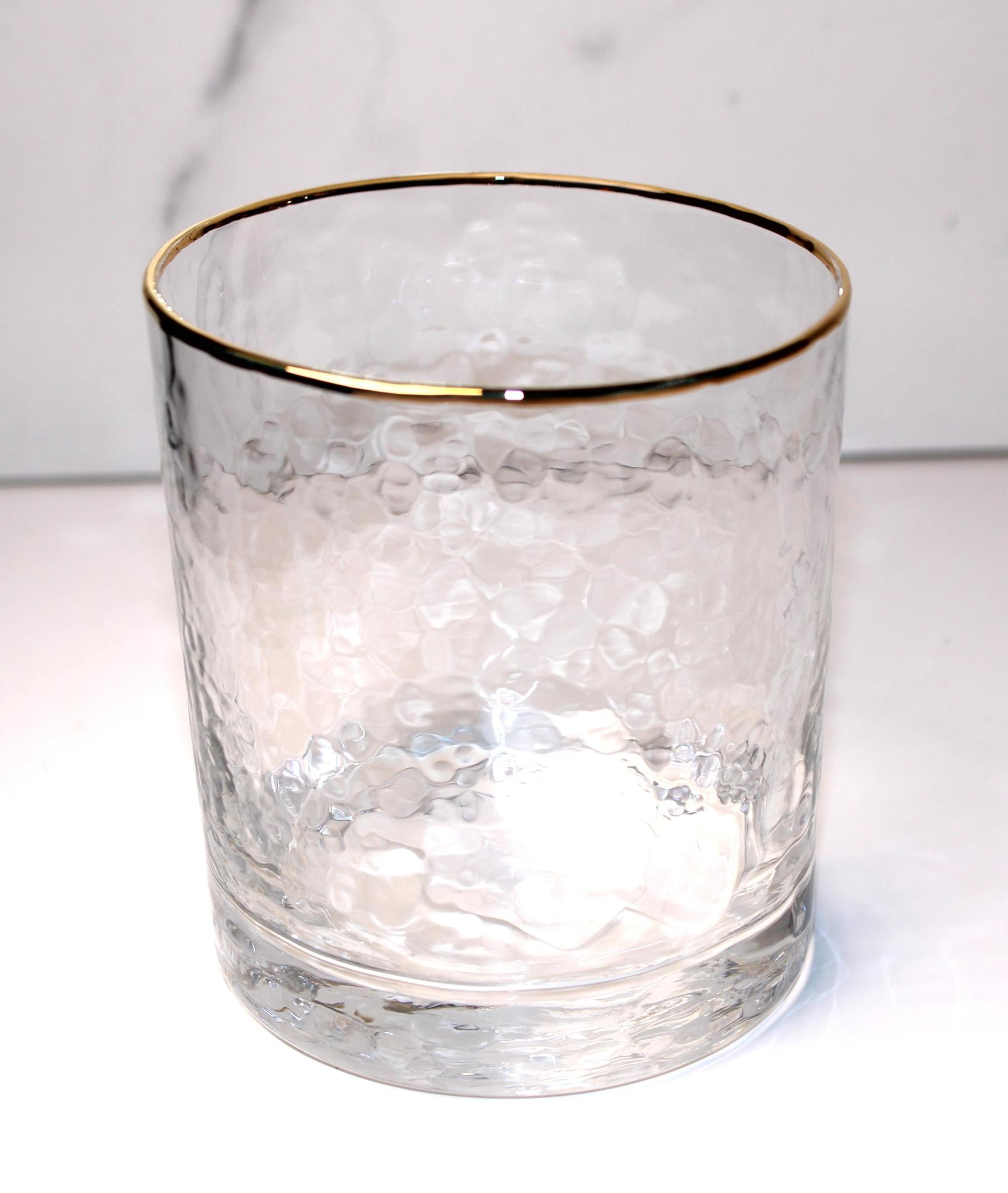 Enhance your drinking experience with our Gold Rimmed Rocks Glass. This elegant hammered glass design features a luxurious gold rim, adding a touch of sophistication to any occasion. Enjoy your favorite drink in style with this stunning addition to your glassware collection.