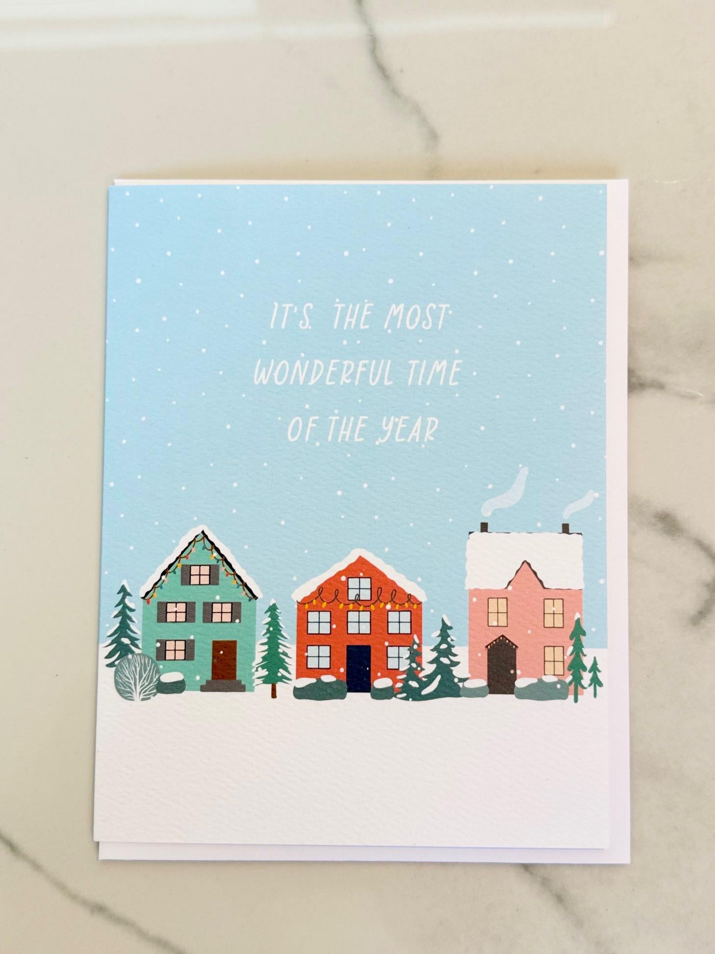 Send holiday wishes with this lovely holiday card illustrated with homes decorated for the holidays on a white Christmas day. Front: It's the most wonderful time of year, blank inside.