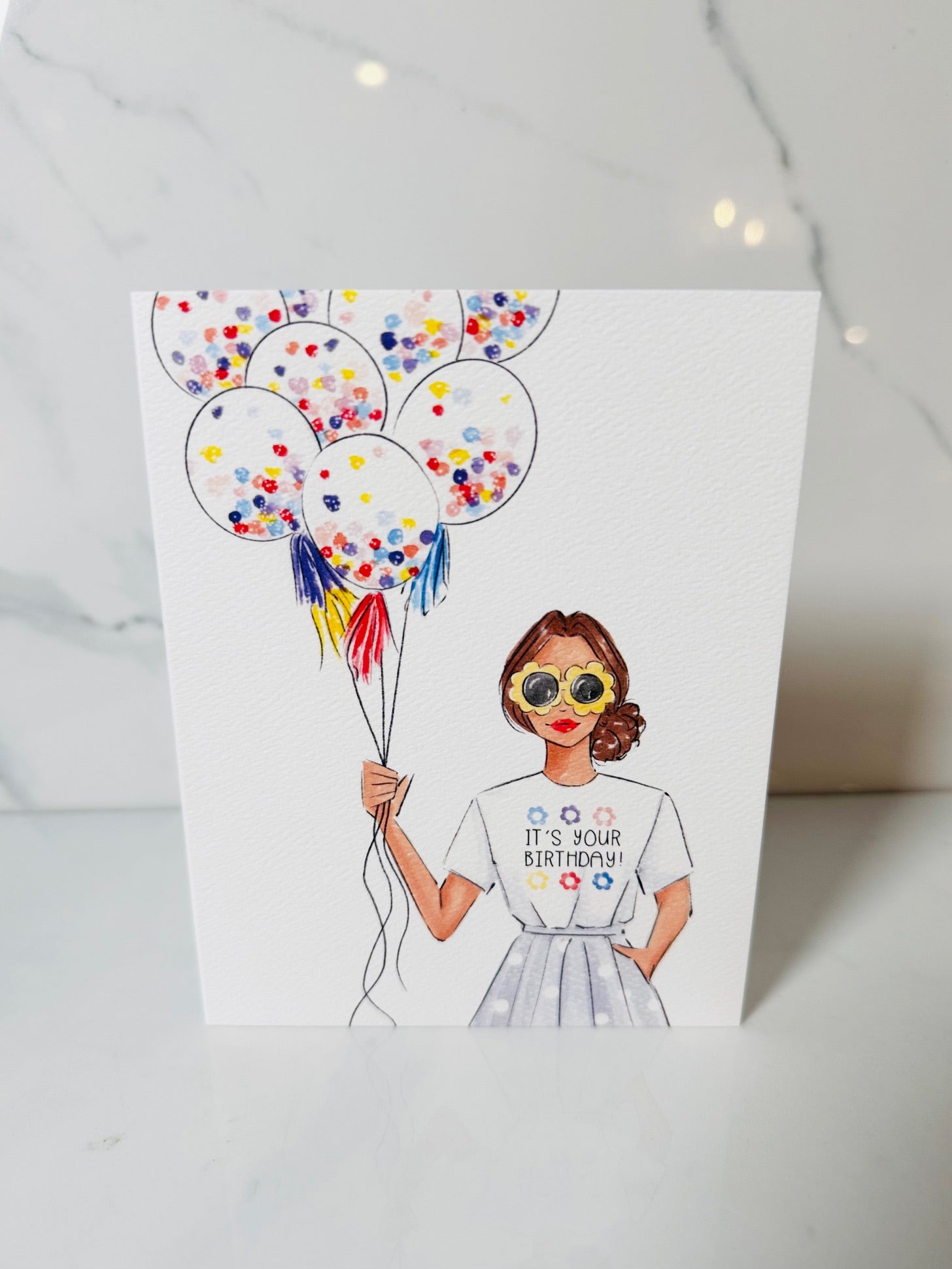 Celebrate a special birthday with this beautifully designed card featuring a joyful girl holding colorful balloons. Perfect for conveying warm wishes and happiness, this card adds a personal touch to any birthday greeting. Its charming illustration captures the festive spirit, making it an ideal choice to brighten someone's special day.