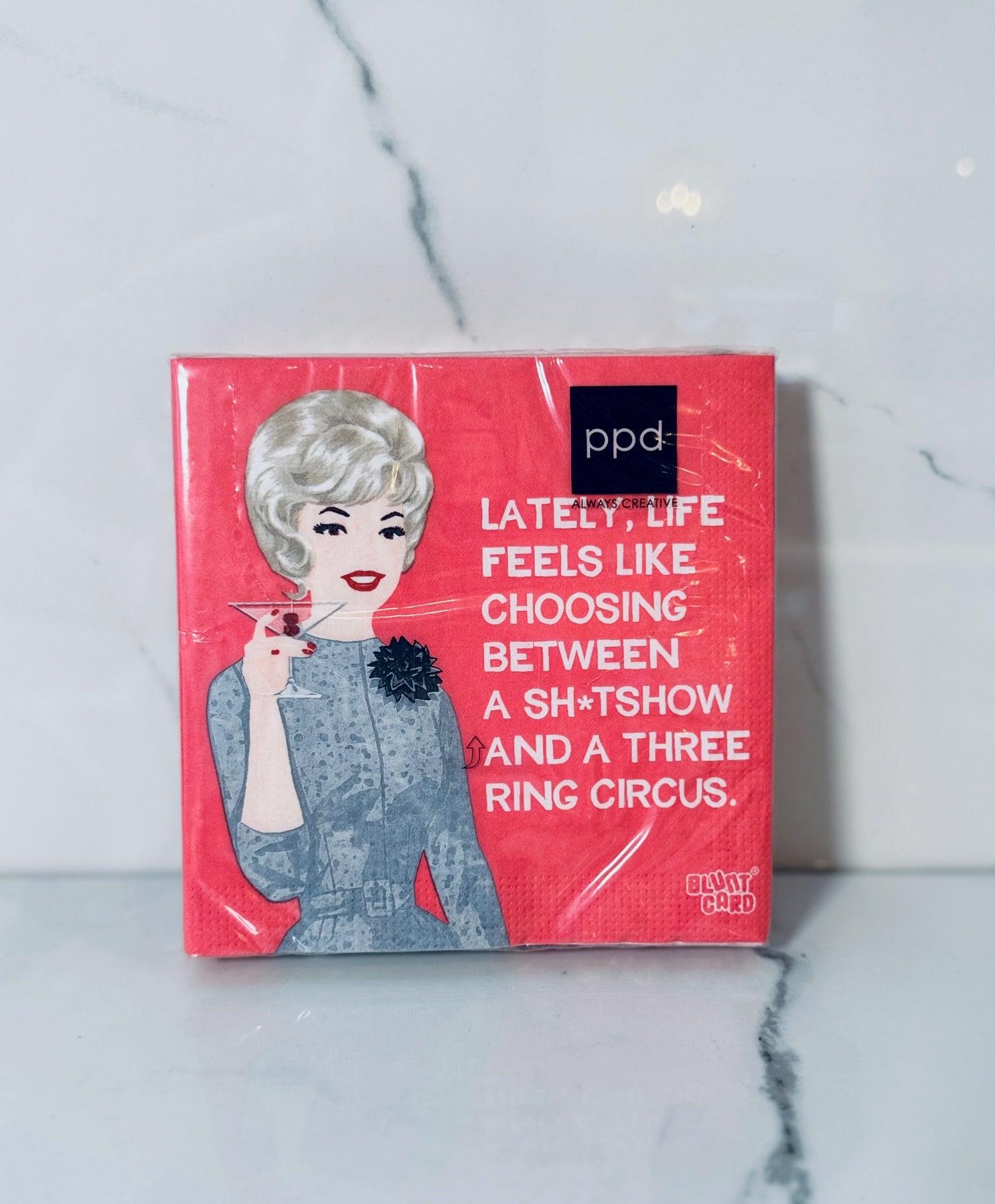 These Lately Life Feels Like Choosing Between a Sh*tshow ad a Three Ring Circus Cocktail Napkins add a touch of humor and warmth to any gathering. Perfect for entertaining, they offer guests a playful reminder maintain your sense of humor! 20 paper cocktail napkins.