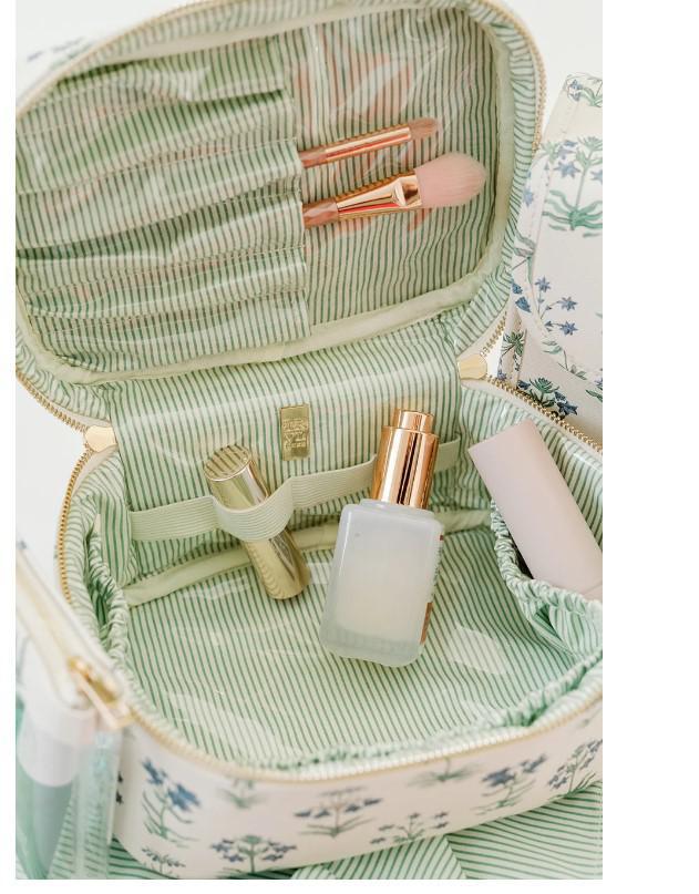 This beautiful train case is crafted in vegan leather with an interior made with a coated pinstripe liner that is completely wipeable. It features a top handle, 2 way zipper puller, an inside removable clear pouch, elastic pockets around the base and elastic loops for makeup brushes and includes a dust bag. Stain resistant and wipeable with clean damp cloth.