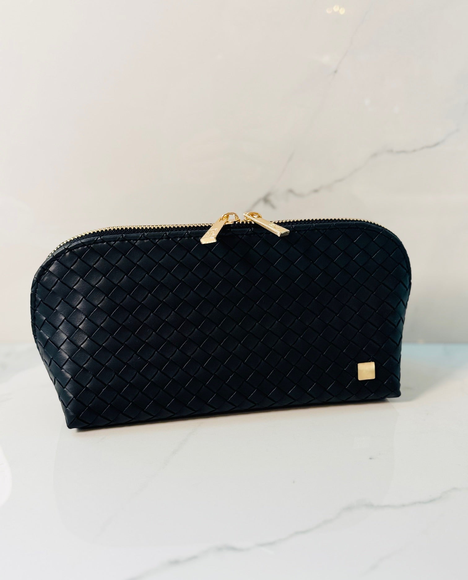 Crafted with a sleek woven design, this black cosmetic bag offers durable protection and stylish organization for your essentials. Its compact yet spacious interior keeps your makeup and toiletries neatly secured, making it an ideal travel companion or everyday accessory. The timeless black finish ensures versatility, blending seamlessly with any bag or luggage. Wipe with damp cloth.