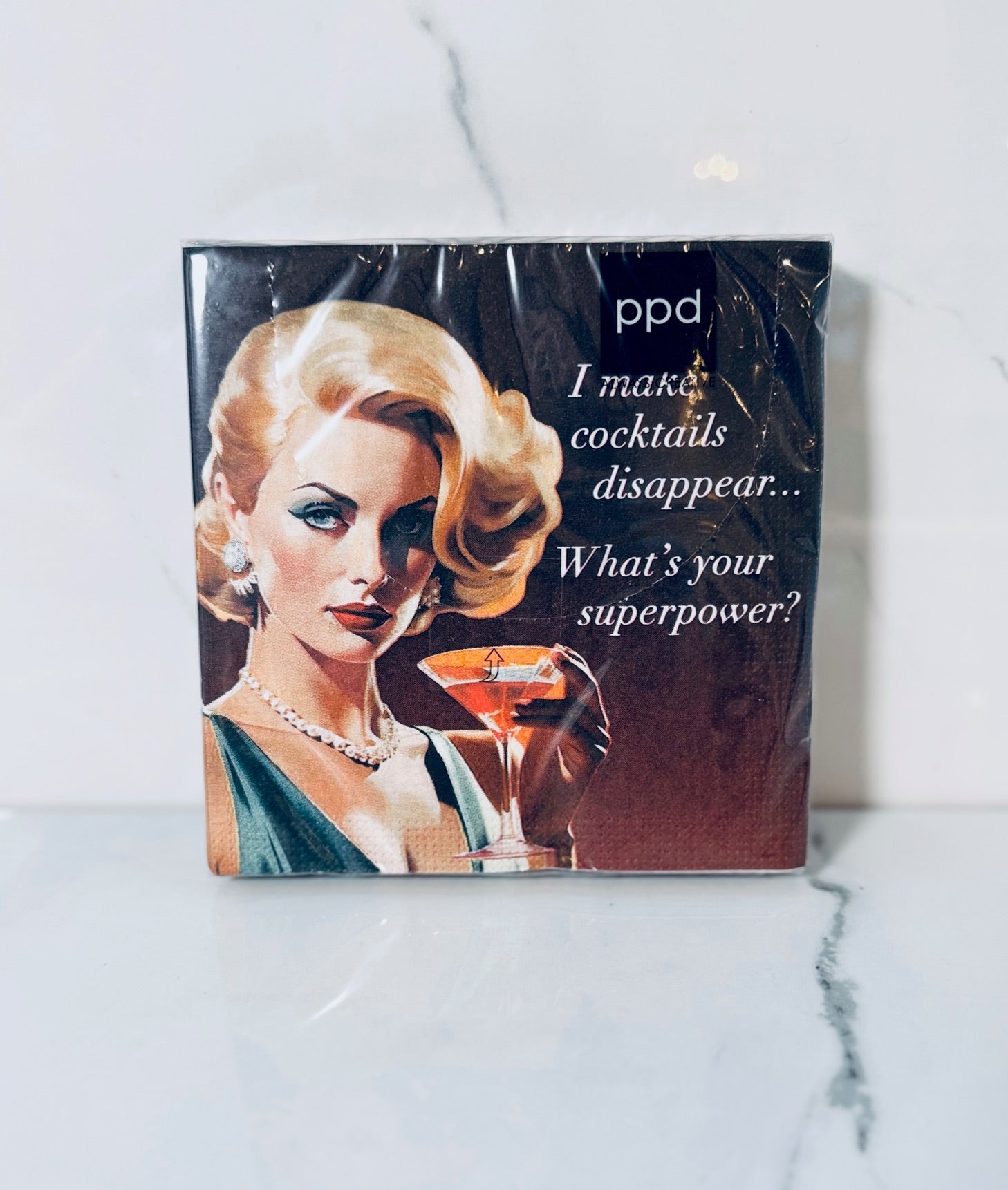 Elevate your entertaining with the I Make Cocktails Disappear, What's Your Superpower Cocktail Napkin, designed to add a touch of fun and humor to any gathering. 20 paper cocktail napkins.