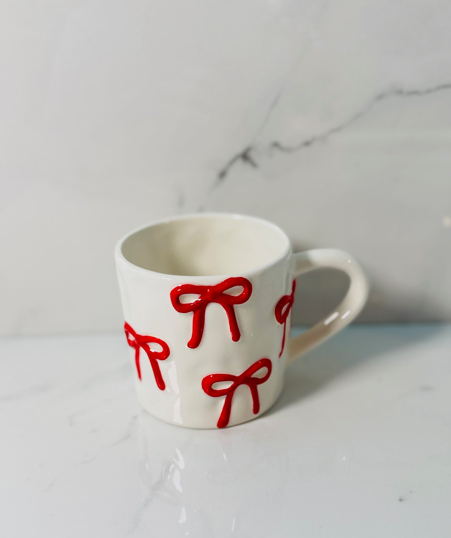 This ceramic mug features a classic design accented with charming red bows, adding a touch of festive elegance to your drinkware collection. Crafted for durability and comfortable grip, it is ideal for enjoying your favorite hot beverages while enhancing your kitchen or office décor with its subtle, stylish detail.