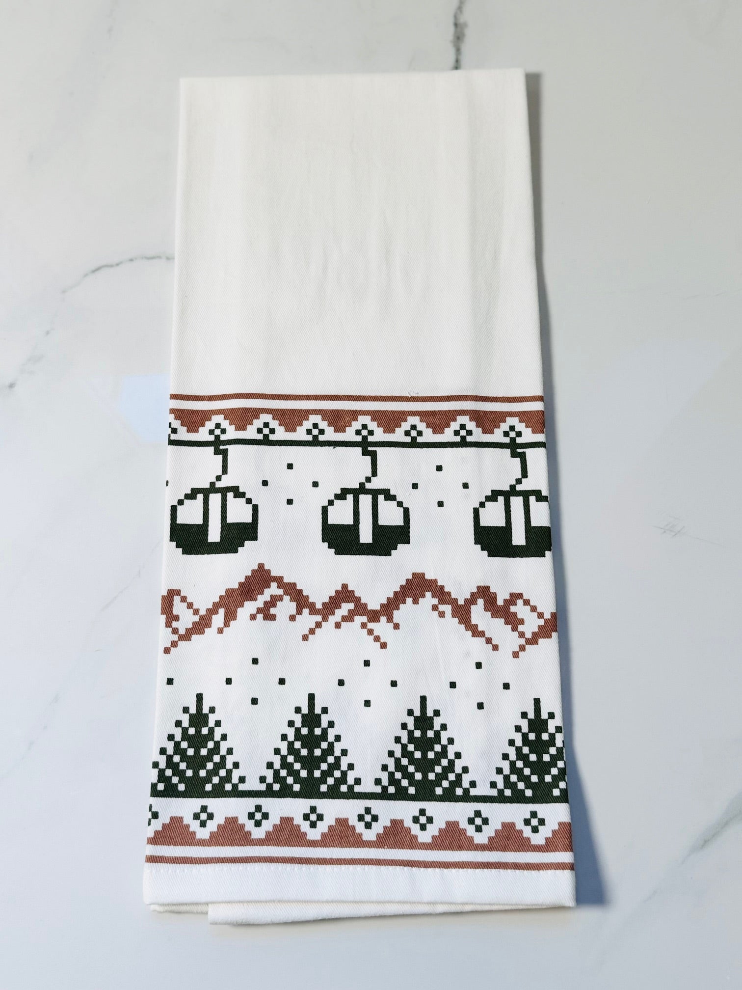The Ski Lift & Pine Hand Towel features a distinctive design with green pine trees and brown ski lifts covering half the towel, while the other half remains a clean, cream color. This contrast adds a sophisticated, rustic touch to any kitchen or bathroom. Made from high-quality, absorbent fabric, it combines practical functionality with seasonal style, ideal for those who appreciate detailed, nature-inspired décor.