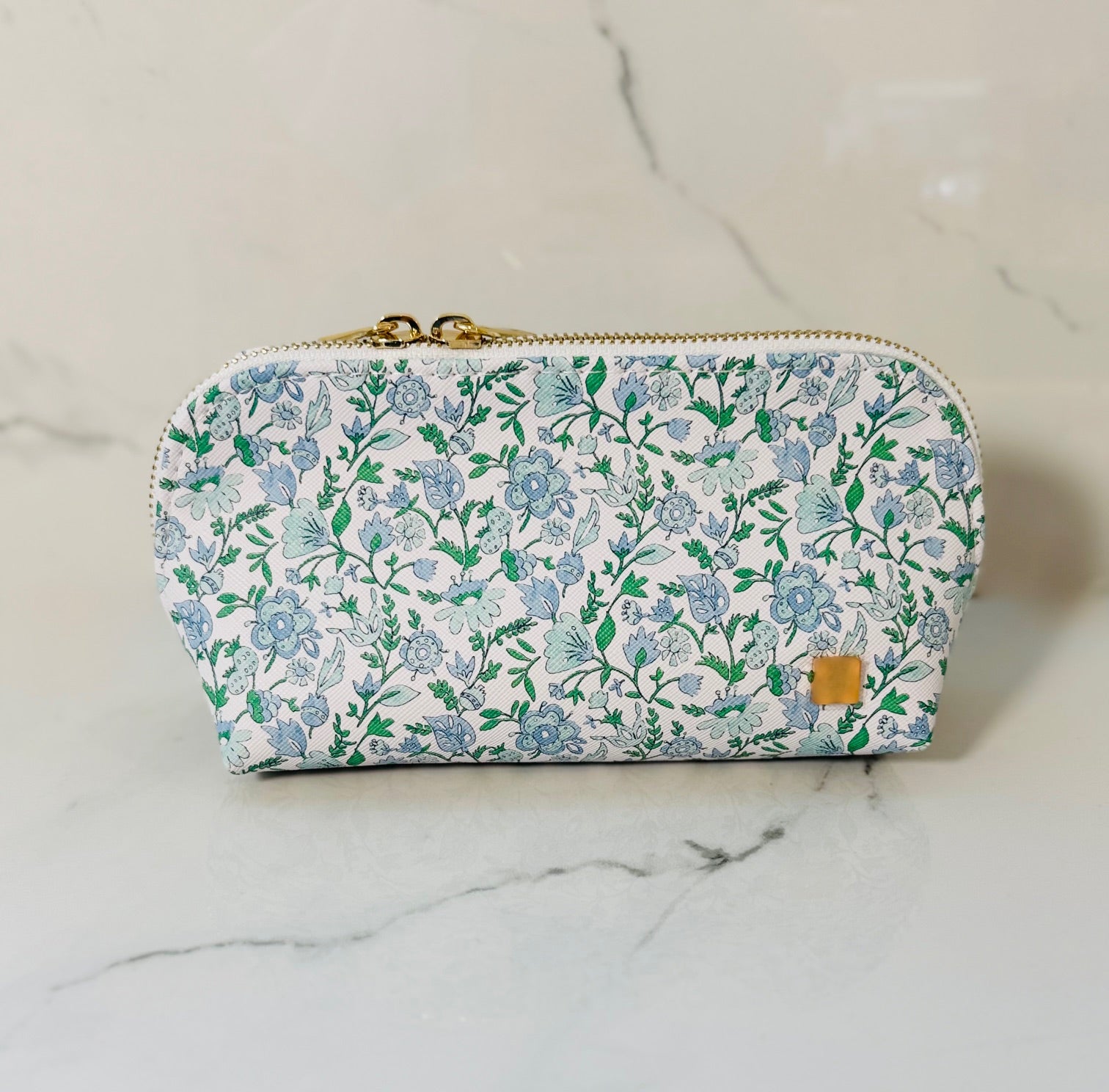 This elegant pouch has a feminine dome shape that is crafted in our signature vegan saffiano, perfectly versatile to fit makeup, brushes, travel toiletries, and small essentials.