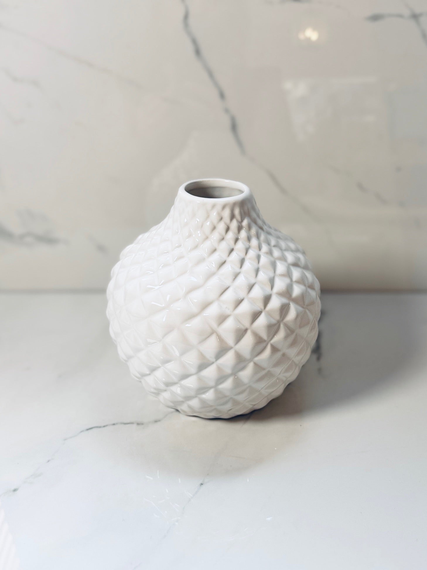 Elevate your décor with this small (approx 5") white honeycomb pattern, featuring a sophisticated basketweave texture that adds depth and visual interest. Its crisp white finish complements a range of styles, while the compact size makes it ideal for displaying fresh flowers or decorative branches in any space. Crafted from durable ceramic, this vase combines timeless design with lasting quality.