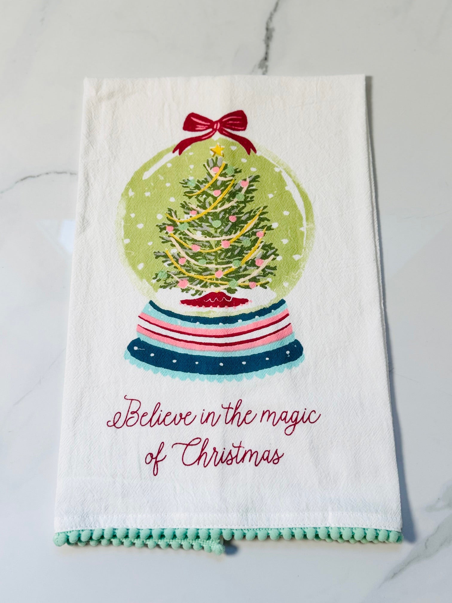 This Snow Globe hand towel features a charming snow globe design with a Christmas tree and the phrase "Believe in the magic of Christmas." It combines festive decoration with practical use, making it a perfect seasonal addition to your kitchen or guest bathroom. Crafted for durability and softness, it brings holiday spirit into everyday routines while enhancing your home’s seasonal decor.