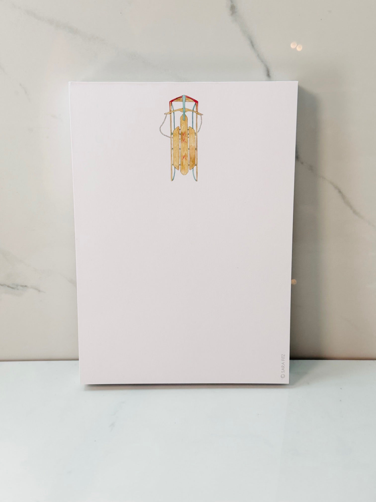 This 5x7 inch Vintage Sled Notepad features 100 pages of high-quality paper, perfect for jotting down notes, lists, or ideas. Each page is adorned with an elegant vintage sled illustration at the top, adding a nostalgic touch to your writing experience. Its compact size makes it ideal for both home and office use, combining functionality with classic design.
