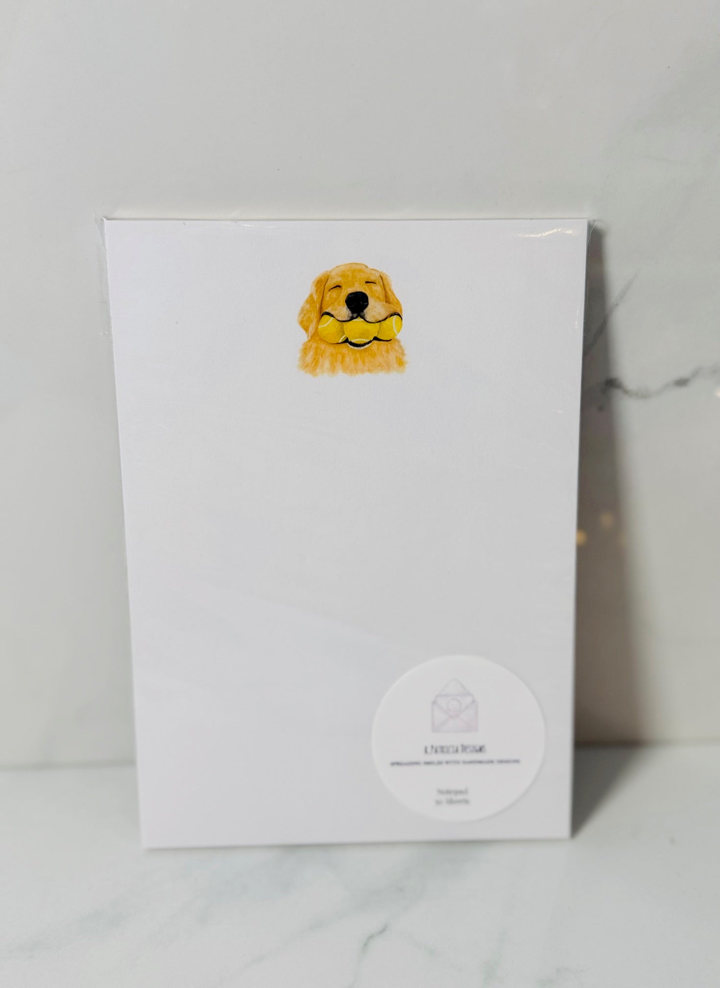 Capture your thoughts and reminders with this dog lovers notepad. Featuring a charming illustration of a Golden Retriever with tennis balls in his mouth, this notepad offers ample space for writing lists, notes, or ideas.