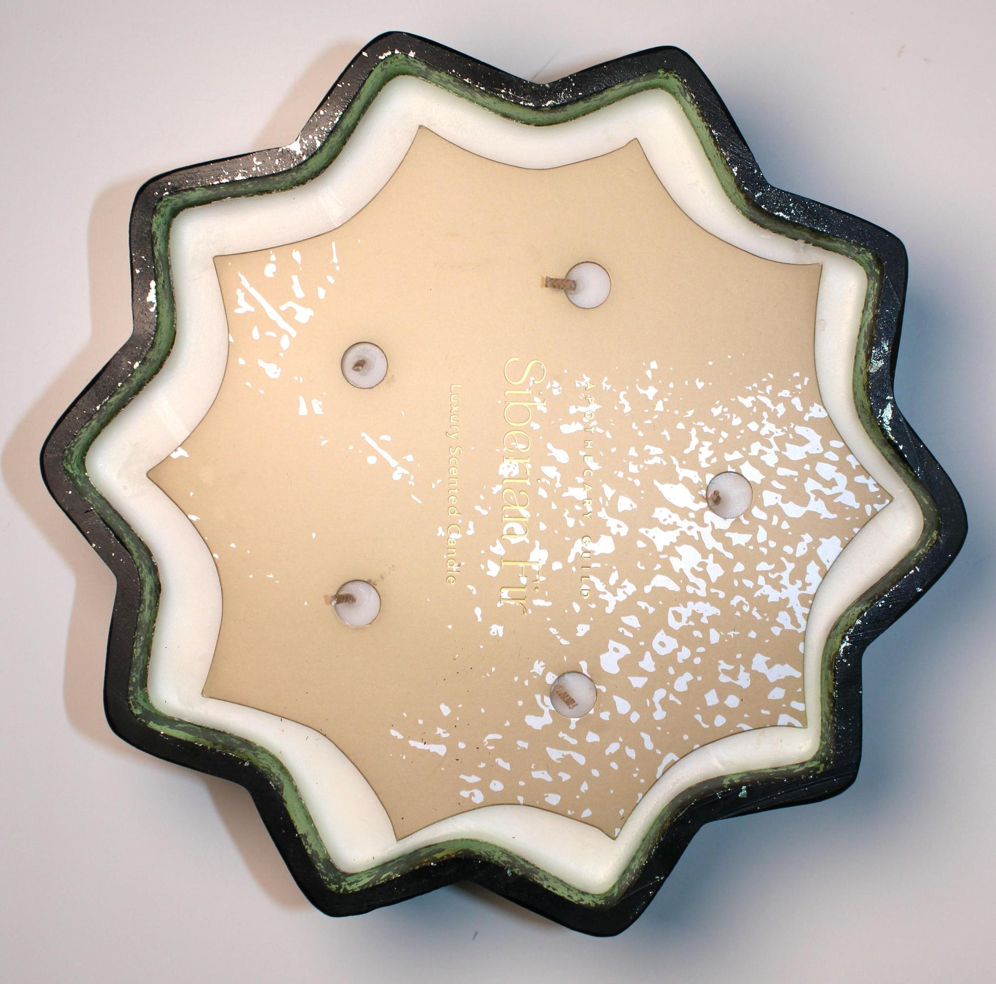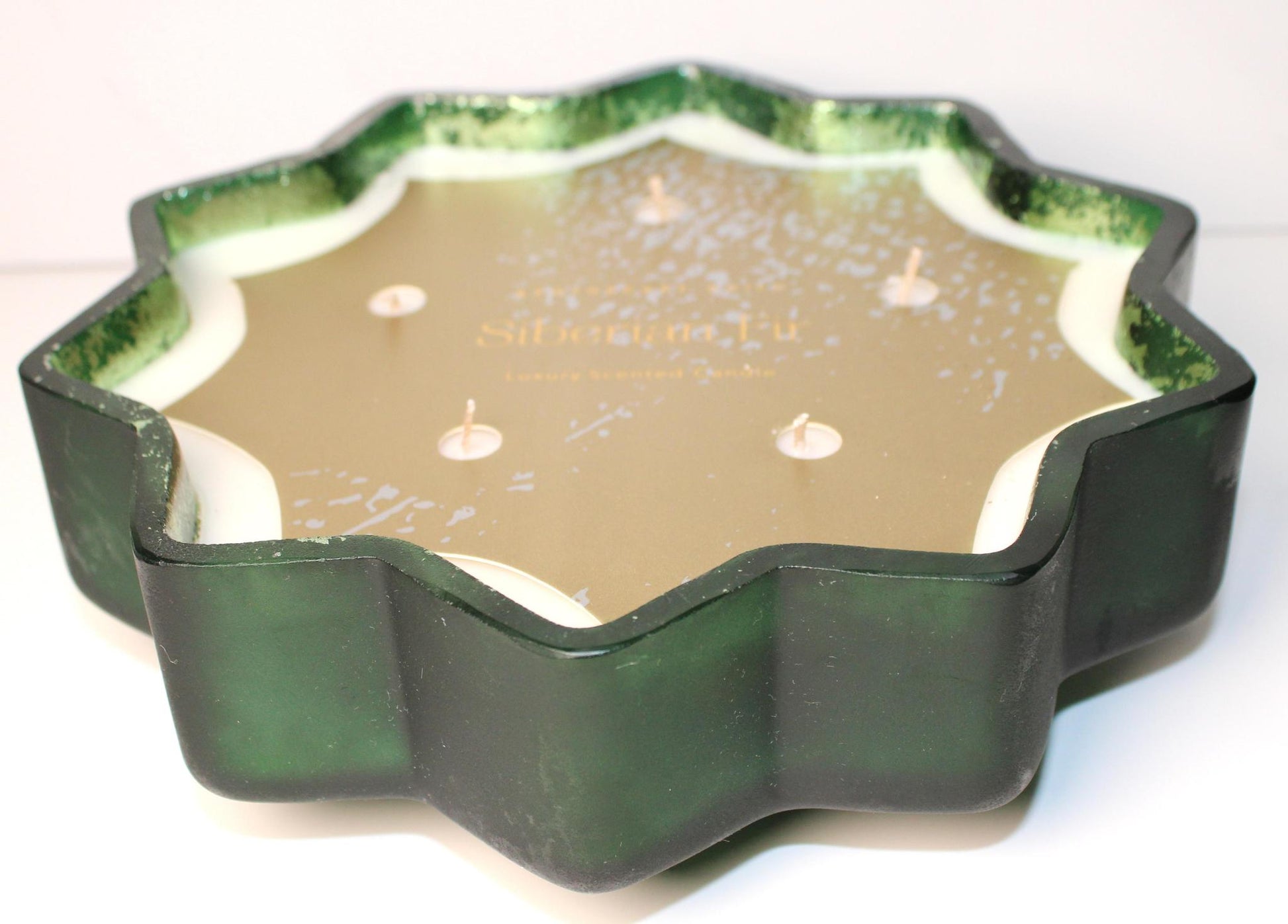 Beautiful Siberian Fir scented candle with five wicks in stunning green vessel, 8" x 2.25". Scent includes notes of fir needle, clove leaf, eucalyptus, juniper, cedarwood and sandalwood. Burn time approximately 75 hours.