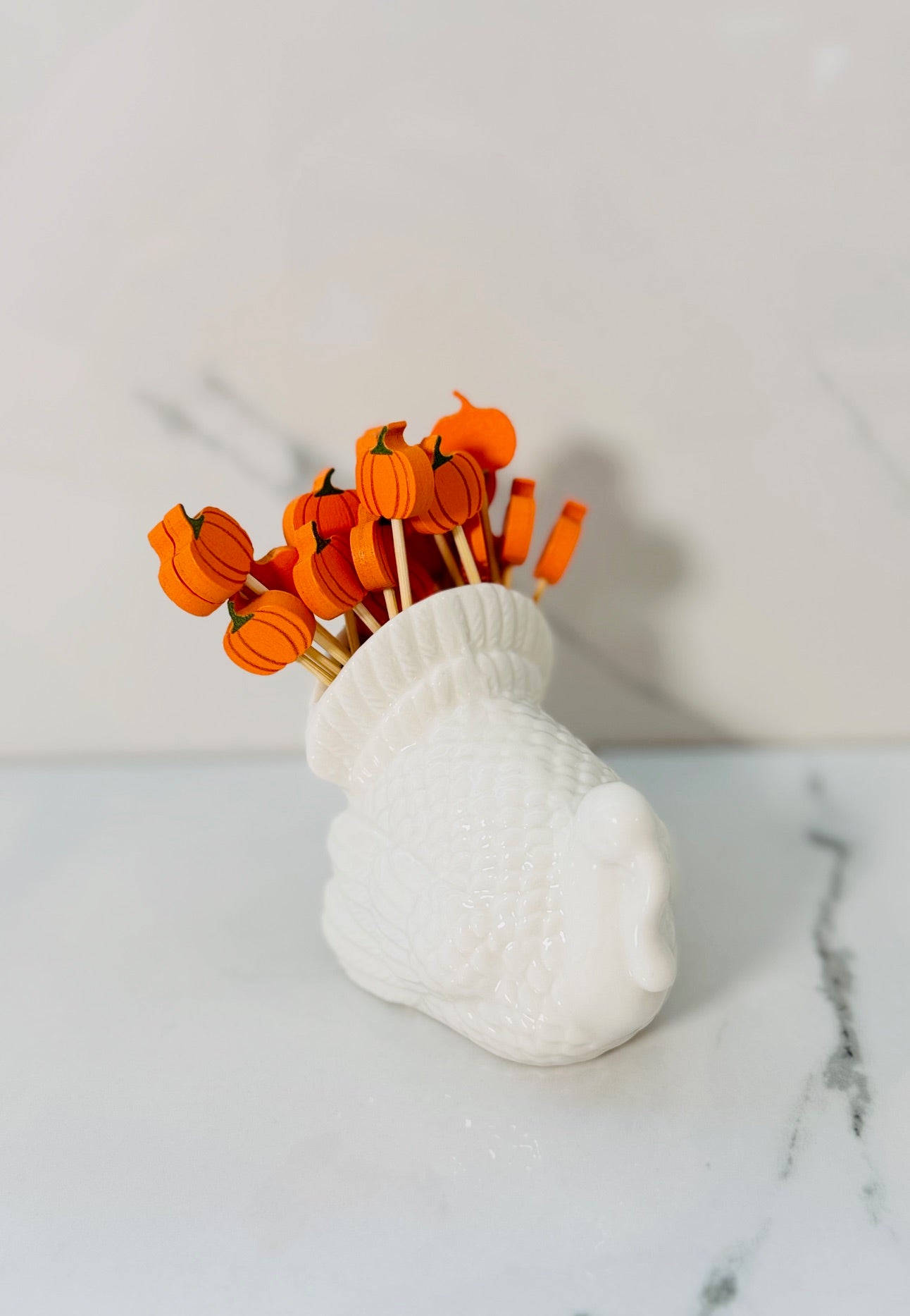 Elevate your holiday table with these expertly crafted ceramic turkey pick holders, complete with festive pumpkin-themed picks. Designed for both functionality and seasonal charm, this set keeps your appetizers organized while adding a warm, autumnal touch to your gatherings. Perfect for serving hors d'oeuvres or small bites, these durable holders ensure easy access and a polished presentation.